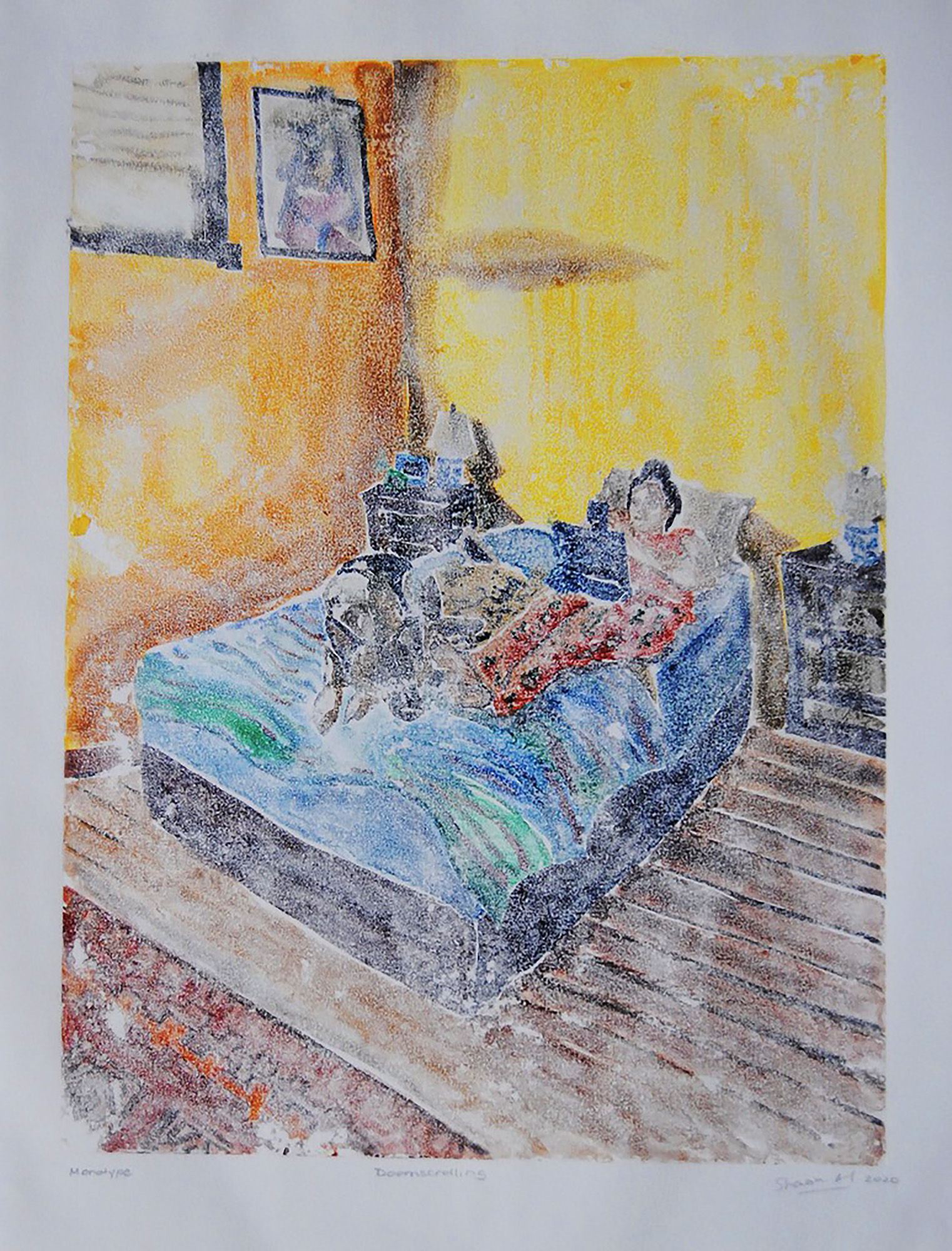 Doomscrolling, 2020, watercolour monotype on BFK Rives Lightweight (cream), 14″ x 18.5″