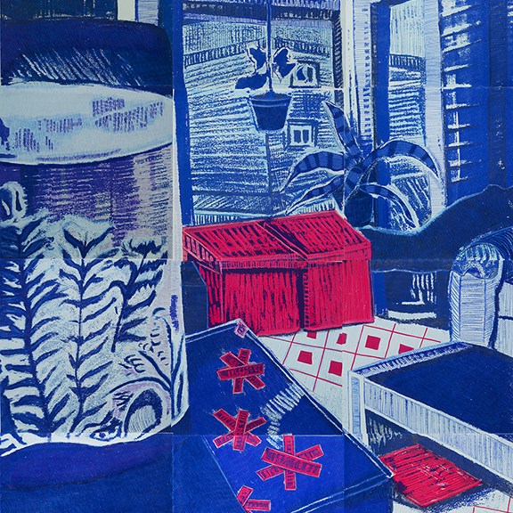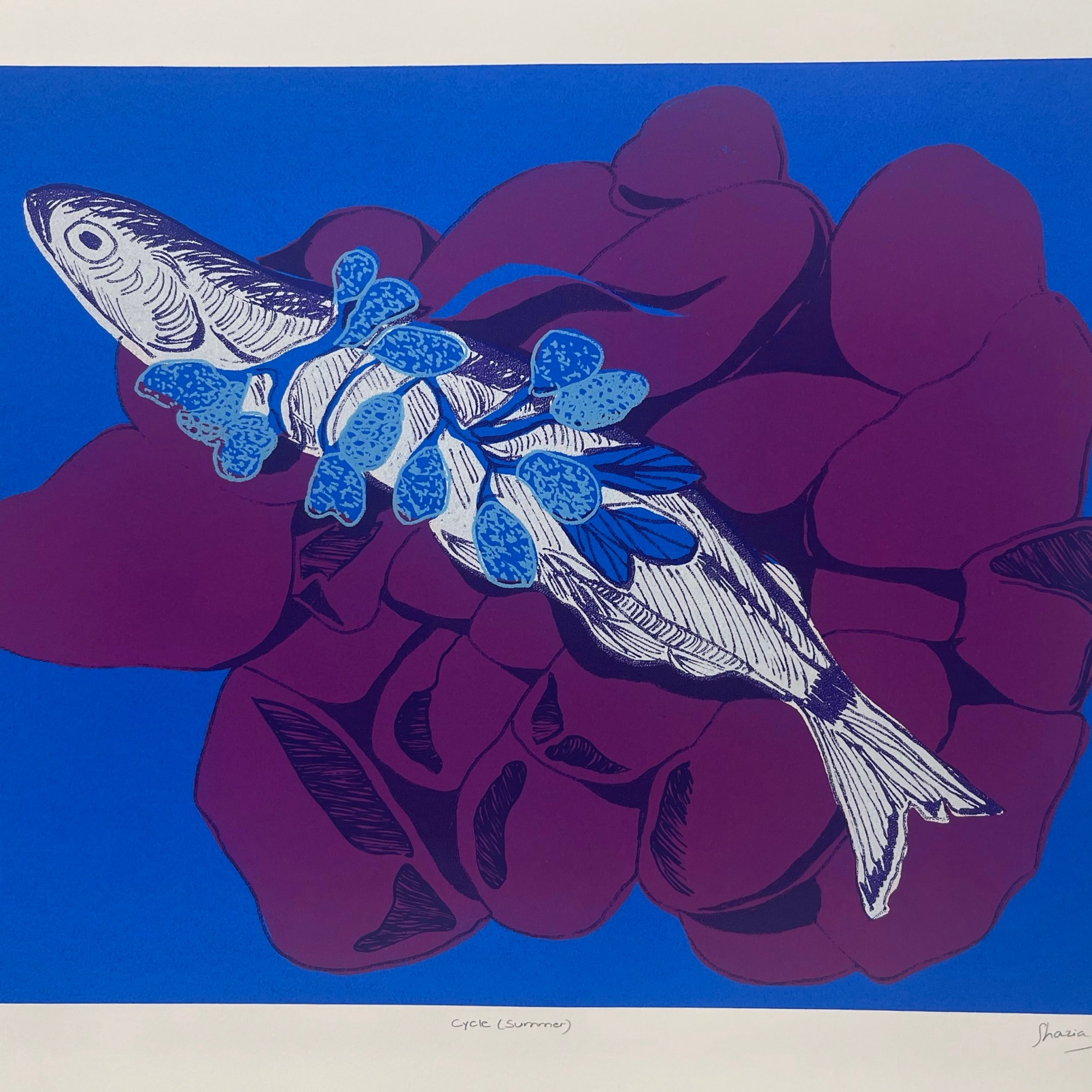 This body of work is about translating the idea of home into something large-scale and participatory, through the medium of printmaking. It comprises works printed on paper and objects constructed from screen-printed materials and fabrics. My work references domesticity in imitating an interior, be it a shelter or a carpet. Incorporating a vibrant limited palette and screen-printed pattern to create the proposed work invites the viewer to interact directly with it. This is not a precious object, it is something to be lived in and lived with. The motifs include capelin and lupins, inspired by my two-year stay in Newfoundland. This work has been generously supported by the Canada Council for the Arts, The Rooms and artch.