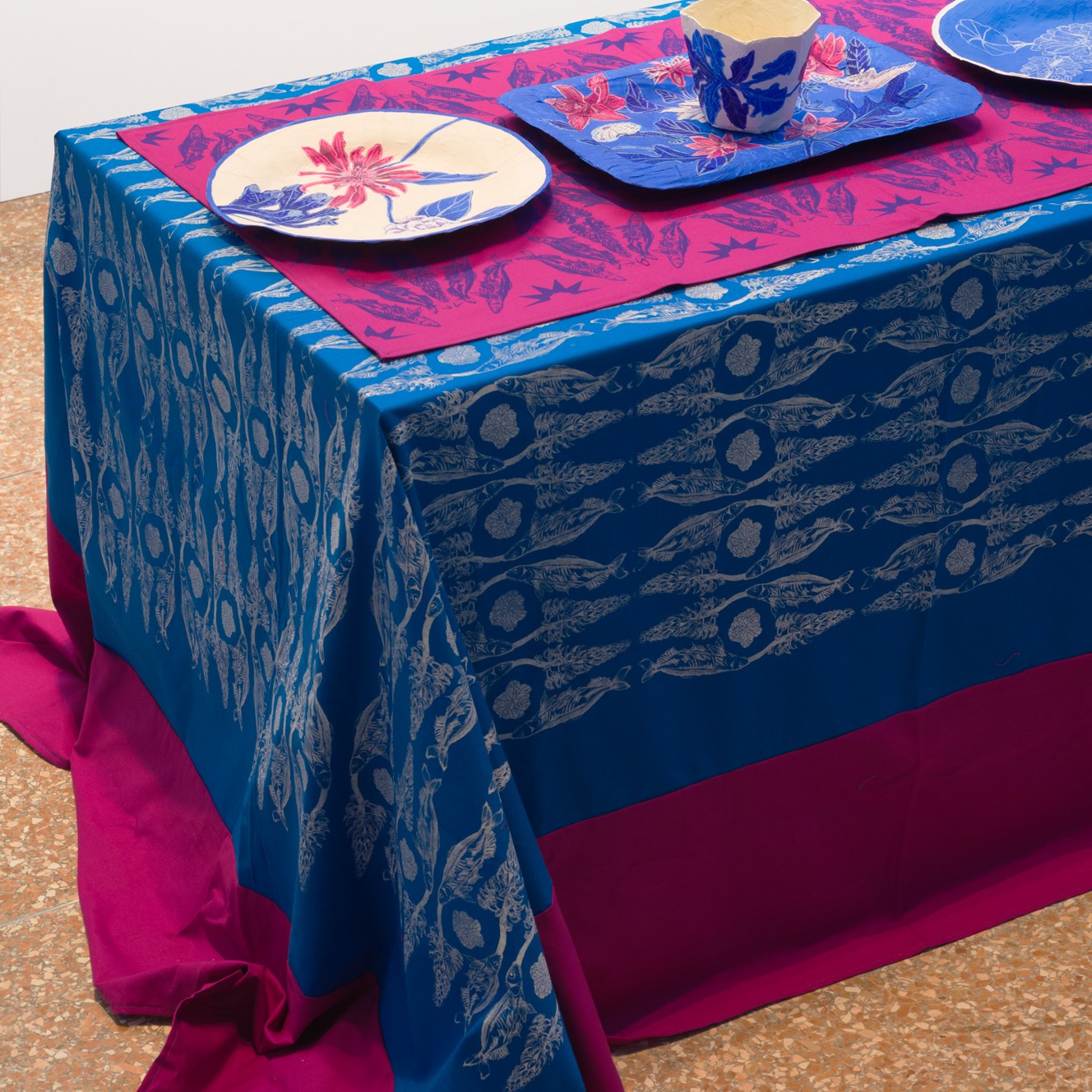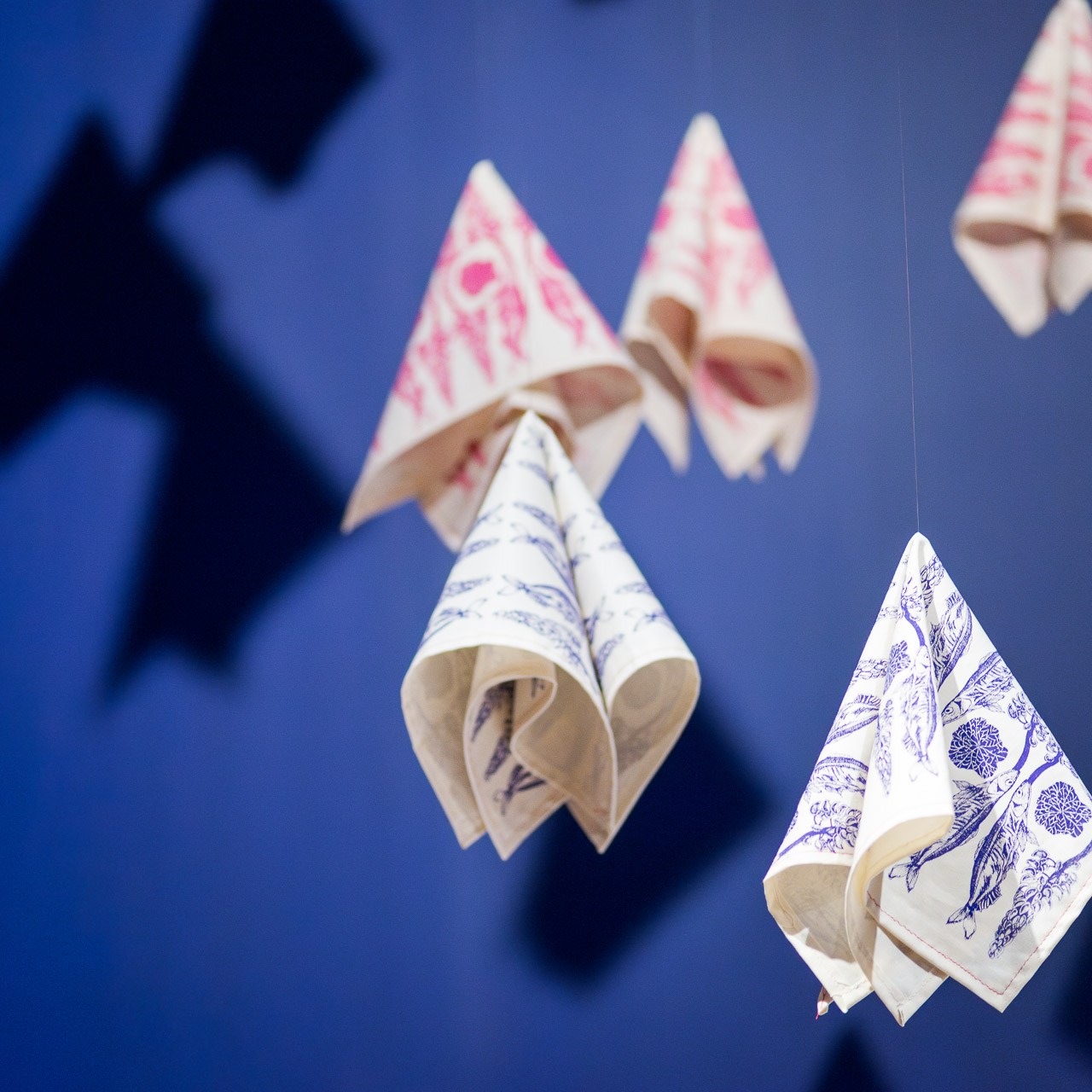 The work Abundance (Come and Sit), consisting of a tablecloth and 24 napkins was part of the traveling group exhibition Making Home Here. Curated by Rachel Gilbert, the show travelled through Newfoundland and Labrador from 2023-2024, with stops at The Labrador Interpretation Centre, The Rooms, Grenfell Art Gallery, and Rocky . The photos at The Rooms, where the show opened in September 2023, were taken by m + e photography.