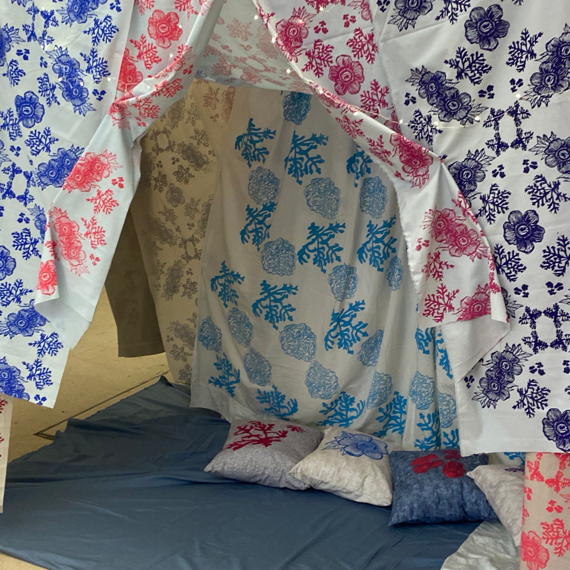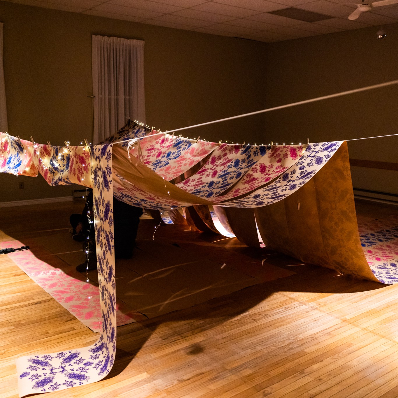 This work, which is a blanket fort constructed out of screen-printed cotton fabric, was part of the 2022 Hold Fast Festival in St. John’s, NL. Documentation is courtesy of m+e photography.