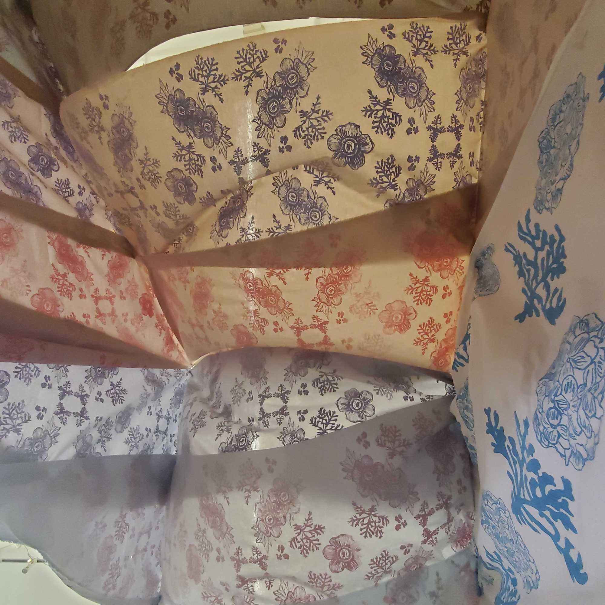 The second iteration of this screen-printed installation, created at St. Michael’s Printshop, was part of CB Nuit, 2022 in Corner Brook, NL. Using the same pattern from Dreaming (2022) and Tenderness (A Meditation on Home), this work consisted of poly-coated Kraft paper rolls printed in my vibrant limited palette, and hung together to create a structure resembling a blanket fort. The installation photographs are courtesy of Tom Cochrane. Many thanks to CB Nuit for its support.
