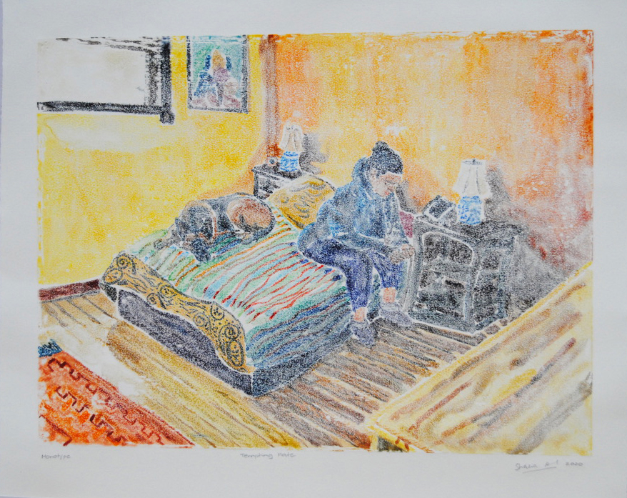 Tempting Fate, 2020, watercolour monotype on BFK Rives Cream lightweight paper, 14.5″ x 18″