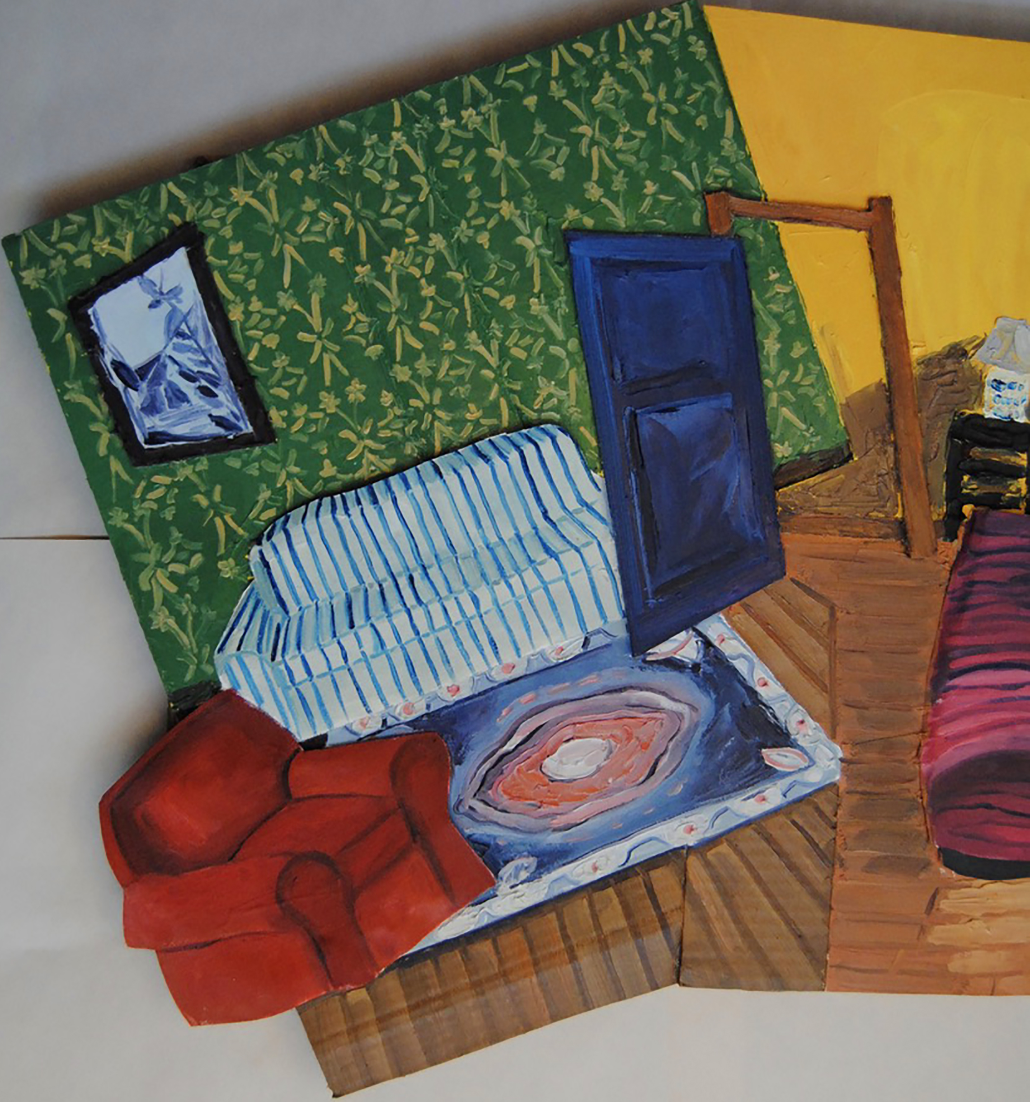 Two Rooms (detail), 2020, oil and mixed media collage on book board, 22.5″ x 33.5″ x 0.5″